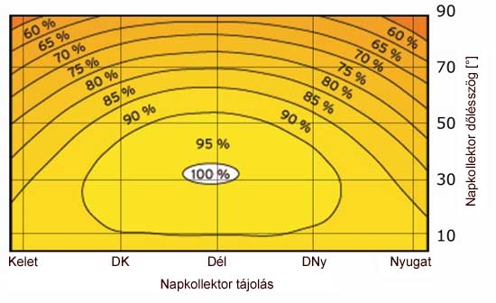 Az EU 2050-re megcélozta, hogy energiaszükségletünk 60 %-át kell biztosítani megújuló energiaforrásokból ! Hazánk éghajlati viszonya lehetővé teszi, hogy gazdaságosan hasznosíthassuk a napenergiát napkollektorokkal, napelemekkel. Évente 2000 - 2200 a napsütéses órák száma, aminek köszönhetően évi 1200-1800 kWó/év/kollektor m2 energiával számolhatunk. Magyarország jelenleg energiahordozó szükségletének 65-70 %-át importból biztosítja A napkollektorok hatékonysága függ annak helyzetétől, a napkollektor felület dőlésszögétől és annak tájolásától. A napkollektorokat optimálisan dél felé kell tájolni. Az azimut szög az eltérést definiálja a kollektor tájolása és pontos déli tájolás között (-90° keleti tájolás, +90° nyugati tájolás). 40°-os keleti vagy nyugati eltérés a déli tájolástól és 45°-60°-os dőlésszög 10% teljesítmény csökkenést jelent a napkollektoroknál, ami az ábráról leolvasható. Ebből következik, hogy 90%-os teljesítmény még elég tág orientációs határokon belül elérhető.