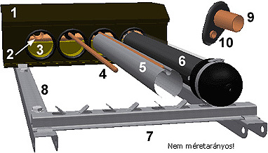 vákuumcsövek átmérője 58 mm, a belső csőé 47 mm. Hosszuk 1800 mm. Fém-üveg